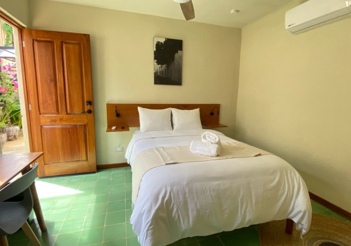 In this space, you'll find a restored colonial room showcasing the colorful pasta tile floors that once adorned homes. The fusion of these two eras creates a harmonious and clean ambiance, inviting you to relax and enjoy a warm and welcoming atmosphere. With our pool just steps away, you can enjoy your mornings savoring a delicious coffee or reading your favorite book. The bed in this room is queen size (1.90 m x 1.50 m).